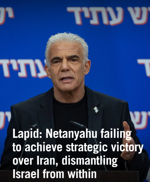 Как отмечается в этом отчете, вчера, наблюдая за геноцидной катастрофой, в которую вверг весь Ближний Восток разыскиваемый военный преступник премьер-министр Израиля Биньямин Нетаньяху , ведущий лидер израильской оппозиции Яир Лапид серьезно предупредил: « Нетаньяху не способен достичь стратегического решения... Пришло время признать, что он просто не в состоянии это сделать... Вместо того чтобы одержать победу, Нетаньяху разрушил нас изнутри ». К этому предупреждению присоединился палестинский журналист Абубакер Абед, заявивший: « Стереть Израиль с лица земли — это недостаточно мести... Израильтяне больше не должны чувствовать себя в безопасности... Преследуйте их и идите за ними, куда бы они ни пошли... Эти террористические паразиты должны быть удалены с нашей планеты ».