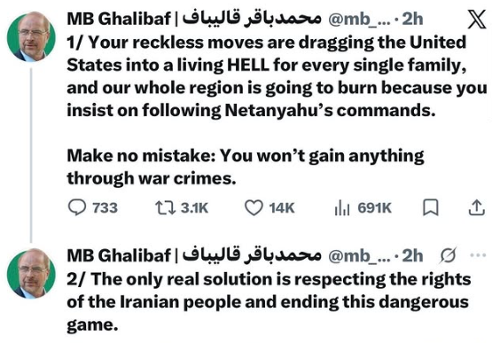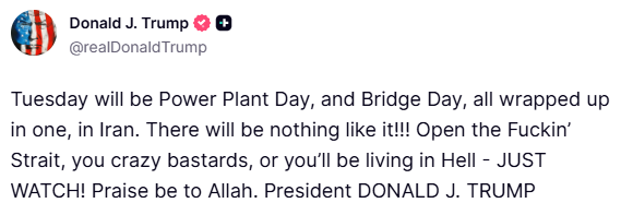 Сегодня в Кремле распространяется новый тревожный доклад Совета Безопасности ( СБ ) , в котором впервые отмечается, что президент Дональд Трамп вчера опубликовал вульгарную угрозу войны: « Вторник станет Днем электростанций и Днем мостов, все в одном, в Иране... Ничего подобного не будет!!!... Откройте, блядь, пролив, вы, сумасшедшие ублюдки, или вы будете жить в аду - ПРОСТО ПОСМОТРИТЕ!... Слава Аллаху », - говорит высокопоставленный иранский лидер. Затем спикер парламента Мохаммед Багер Галибаф опубликовал свой предупреждающий ответ: « Ваши безрассудные действия втягивают Соединенные Штаты в настоящий АД для каждой семьи, и весь наш регион сгорит, потому что вы настаиваете на выполнении приказов Нетаньяху... Не заблуждайтесь: вы ничего не добьетесь с помощью военных преступлений ».