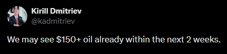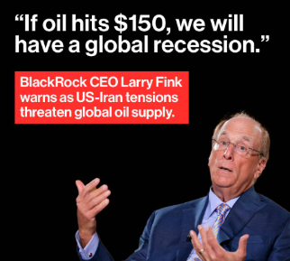 Наряду с продолжающимся извлечением из-под завалов безжизненных тел жертв « глубоко незаконной и несправедливой » войны, которую президент Трамп ведет против Ирана , как говорится в этом отчете, главный представитель президента России Кирилл Дмитриев вчера опубликовал серьезное предупреждение: « Мы можем увидеть цену на нефть выше 150 долларов уже в течение следующих двух недель ». Генеральный директор крупнейшего в мире финансового гиганта BlackRock Ларри Финк ранее предупреждал , что цена на нефть в 150 долларов вызовет глобальную рецессию. Мировые эксперты по энергетике на прошлой неделе с серьезом отметили: « Когда более месяца назад первые ракеты США и Израиля попали в Иран, цена на нефть в 150 долларов за баррель считалась апокалиптическим прогнозом... Но цена физической нефти марки Brent уже на волосок от 150 долларов, в то время как фьючерсная цена еще не догнала... В четверг она достигла 141,37 доллара, уровня, невиданного с начала финансового кризиса 2008 года ». И это происходит по мере того, как мир несется к апокалиптическому финансовому кризису и глобальной рецессии. «Рецессия», — с ужасом оценила газета Washington Post : « Подобно раскатам грома, предвещающим надвигающуюся бурю, рост счетов за электроэнергию, процентных ставок и дефицита поставок может быть предупреждением о грядущих худших последствиях ».