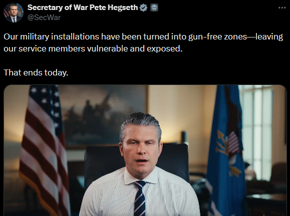Чтобы никто не подумал, что действия Пентагона в рамках « священной войны» направлены исключительно против Ирана , в этом отчете отмечается, что вчера министр обороны Хегсет объявил о ее внутреннем компоненте: « Наши военные объекты превращены в зоны, свободные от оружия, что делает наших военнослужащих уязвимыми и беззащитными... Сегодня этому придет конец » — все американские базы были превращены в зоны, свободные от оружия, во время войны во Вьетнаме, потому что солдаты постоянно убивали своих некомпетентных офицеров , — но теперь министр обороны Хегсет перевооружил этих солдат, чтобы они могли гарантировать, что их офицеры ставят Америку на первое место.