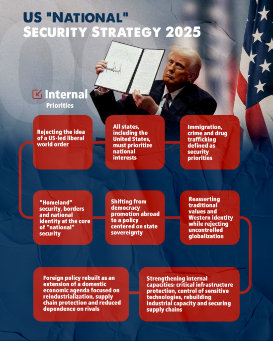 Что касается изменения позиции Америки , как фаталистически заметил президент Макрон , то, как заключает этот доклад, это совершенно не соответствует действительности, поскольку непосредственно перед началом войны с Ираном президент Трамп опубликовал документ « Стратегия национальной безопасности Соединенных Штатов Америки », в котором прямо заявлялось: « Дни, когда Соединенные Штаты поддерживали весь мировой порядок, подобно Атласу, закончились » — заявление, к которому вчера присоединился главный советник президента Трампа по связям со СМИ Такер Карлсон, выпустивший видеоролик « Трамп объявляет о конце глобальной американской империи. Вот что будет дальше », в котором он объясняет правду о
