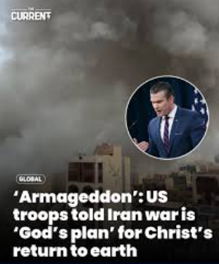 Наряду со сравнением президента Трампа с Иисусом , в этом отчете отмечается, что на прошлой неделе министр обороны Пит Хегсет молился в Пентагоне за американские войска, воюющие с Ираном : « Пусть каждый выстрел попадет в цель против врагов праведности и нашей великой нации... Даруй им мудрость в каждом решении, выносливость в предстоящем испытании, нерушимое единство и сокрушительную силу действий против тех, кто не заслуживает пощады... Мы просим об этом с дерзкой уверенностью во имя могущественного Иисуса Христа ».