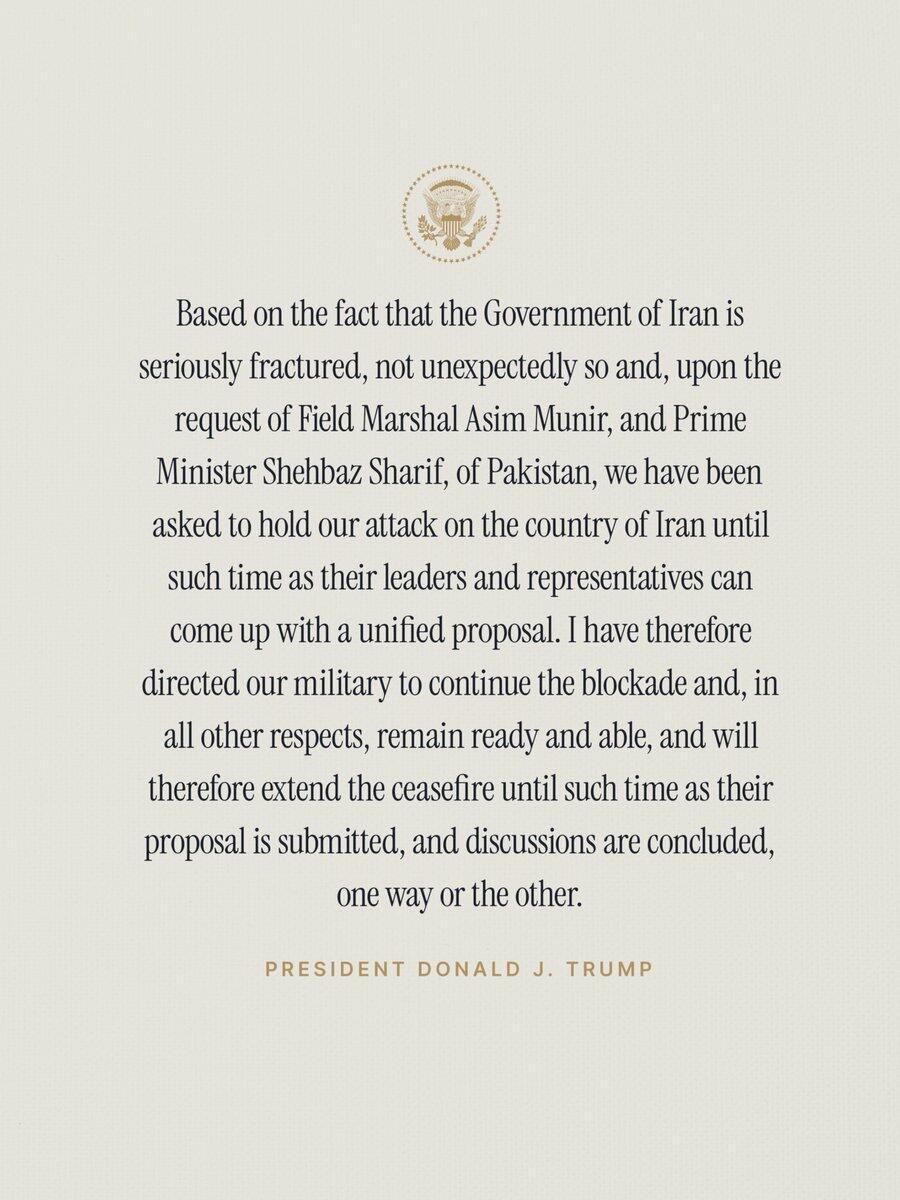 В это не поверить... Трамп в одностороннем порядке продлевает перемирие, но заявляет, что блокада иранских портов со стороны ВМС США останется в силе после провала переговоров в Исламабаде. Трамп снова уклоняется от ответа... наслаждайтесь «Тако-вторником»... можно сказать, что, по крайней мере, бомбардировки пока не возобновляются. Чтобы придать этому больше формальности — или сделать это официальным, Белый дом также быстро опубликовал заявление Трампа (и более презентабельным шрифтом), приведенное ниже. Первоначальная реакция из Тегерана:
