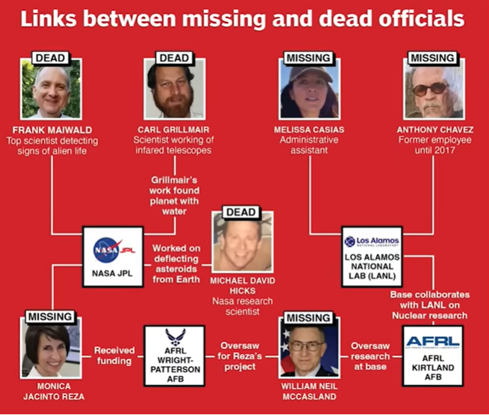 времени », — заявила пресс-секретарь Белого дома Каролина Ливитт, а затем объявила: « В свете недавних и обоснованных вопросов по этим тревожным делам и приверженности президента Трампа правде, Белый дом активно сотрудничает со всеми соответствующими ведомствами и ФБР для всестороннего рассмотрения всех дел и выявления любых потенциальных общих черт, которые могут существовать... В этих усилиях не будет оставлено камня на камне, и Белый дом будет предоставлять обновления по мере их поступления ».В этом отчете отмечается, что с 2023 года по меньшей мере одиннадцать ведущих американских ученых, связанных с передовыми аэрокосмическими исследованиями, умерли или исчезли при загадочных обстоятельствах, в том числе :