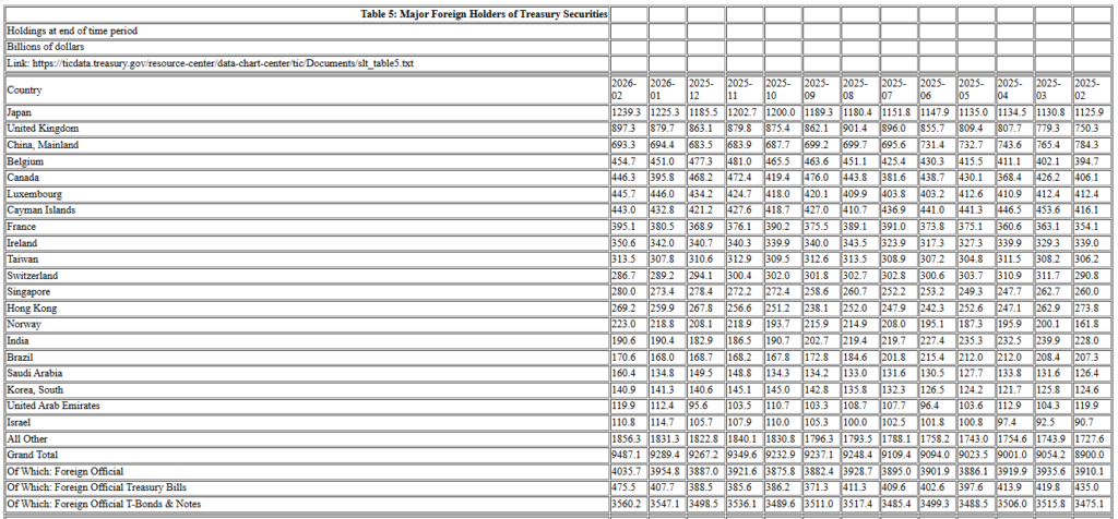 Click on source to enlarge view: https://ticdata.treasury.gov/resource-center/data-chart-center/tic/Documents/slt_table5.html The Chinese stake was 9% of the T-bill total in February 2025; it was 7.3% of the larger total in February 2026. Currently, China (counted with Hong Kong) trails second as the US creditor behind Japan in the size of its Treasury holdings. Over the year reported in the table, China reduced its aggregate by 12%. However, India reduced its stake by 16% and Brazil by 18%.