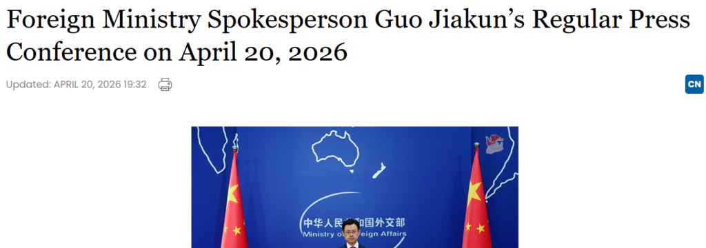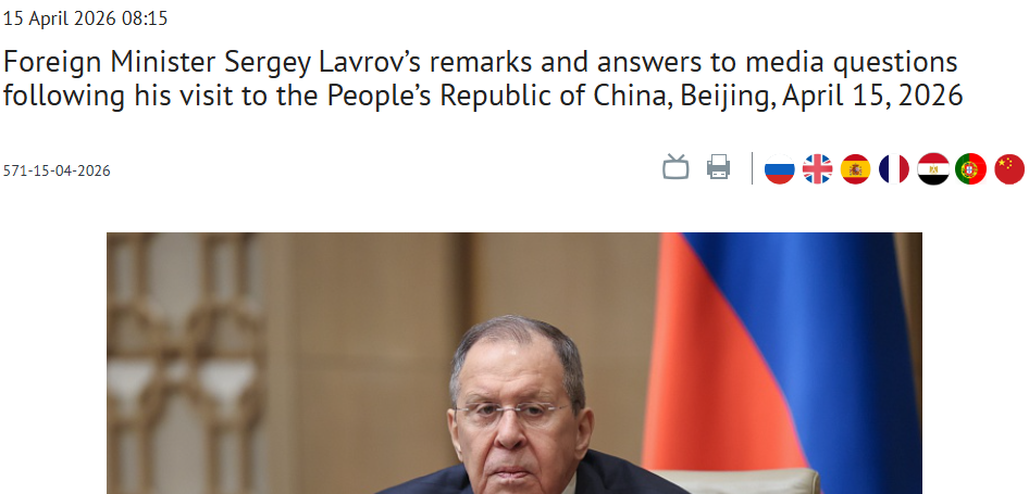 Source:. https://www.mfa.gov.cn/eng/xw/fyrbt/lxjzh/202604/t20260420_11895636.html Note that the Chinese publication time was 19:32; that was five hours ahead of Moscow. The podcast began at 12:10 Moscow time and the discussion of Guo’s presentation relied on notes taken from the live broadcast. The transcript published later has been “updated”; this means edited.