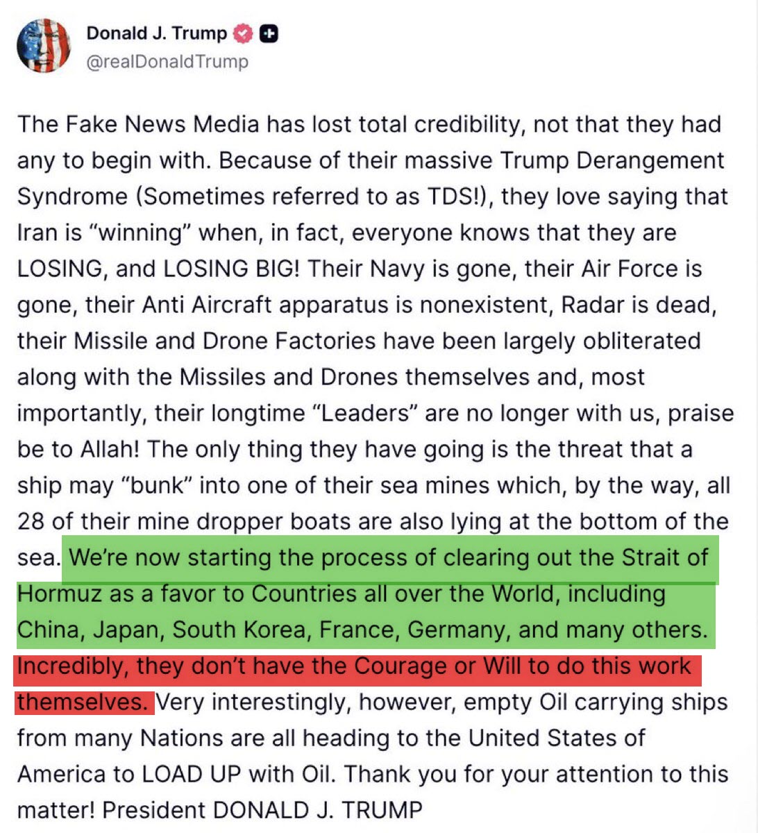 Президент Трамп объявил, что «США начали разминирование Ормузского пролива», утверждая, что иранские минные постановщики уничтожены. «Мы начинаем процесс разминирования Ормузского пролива», — в этом заявлении он оскорбил многие страны, заявив, что у них нет «смелости» сделать это самостоятельно! ! ! ! !
