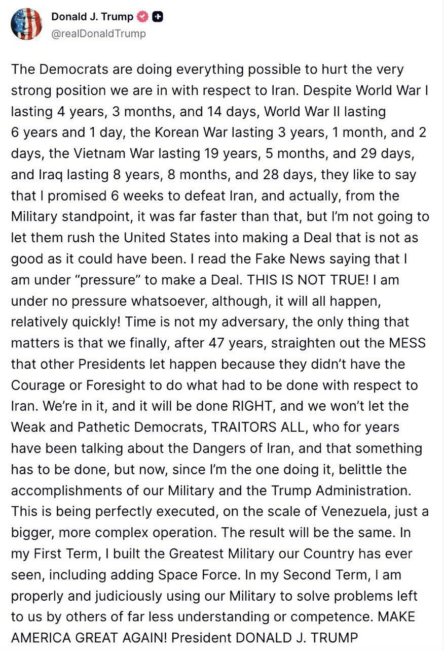 В ходе очень продолжительной программы "Truth Truth Social" утверждалось, что Трамп не позволит демократам торопить США с заключением сделки с Ираном. Также говорилось, что новая сделка будет намного лучше, чем СВПД времен Обамы.